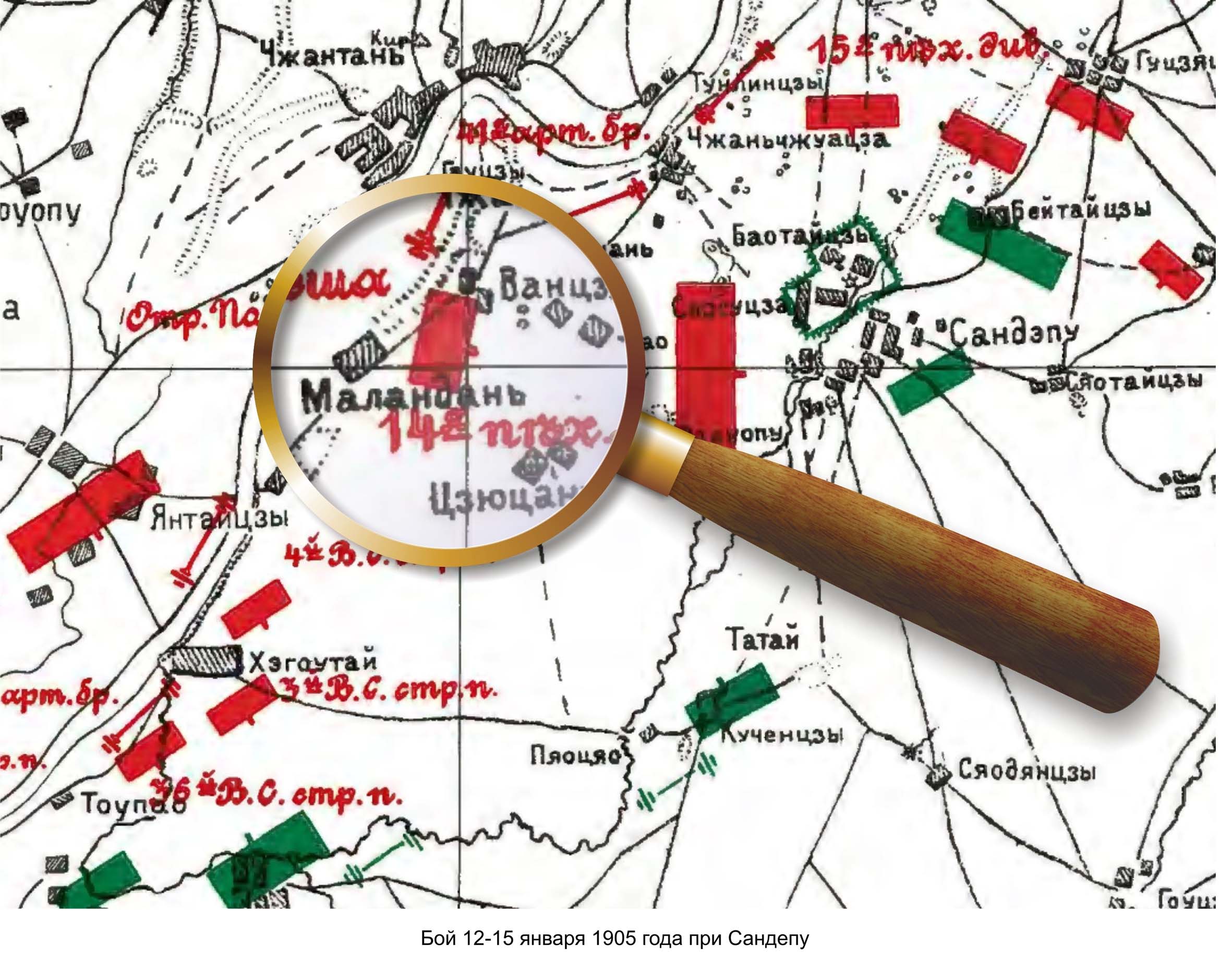 Можно попытаться конкретизировать отличия Тимановского в боях с японцами. Под Ляояном 1-й ВССП участвовал в жарких боях 17–18 августа 1904 г. у деревень Гуцзяцзы и Маэтунь, потеряв убитыми 78 нижних чинов, ранеными и контуженными 12 офицеров и 417 нижних чинов.13 Наибольшие потери в этих боях понес 3-й ВССП, 19 августа 11-я рота 1-го ВССП (капитана Вискунова) была направлена на переноску раненых из этого полка.14 В последующие дни Ляоянского сражения потрепанный 1-й Сибирский армейский корпус был оттянут на тыловые позиции, следовательно, у солдат не было возможности отличиться и заслужить крест.15 Таким образом, можно полагать, что первый Знак отличия Военного ордена заслужен им с боях под Гуцзяцзы и Маэтунем. Отличие в январе 1905 г. связано с боями при Сандепу, вероятнее всего – 15 января 1905 г. у Маланданя.16