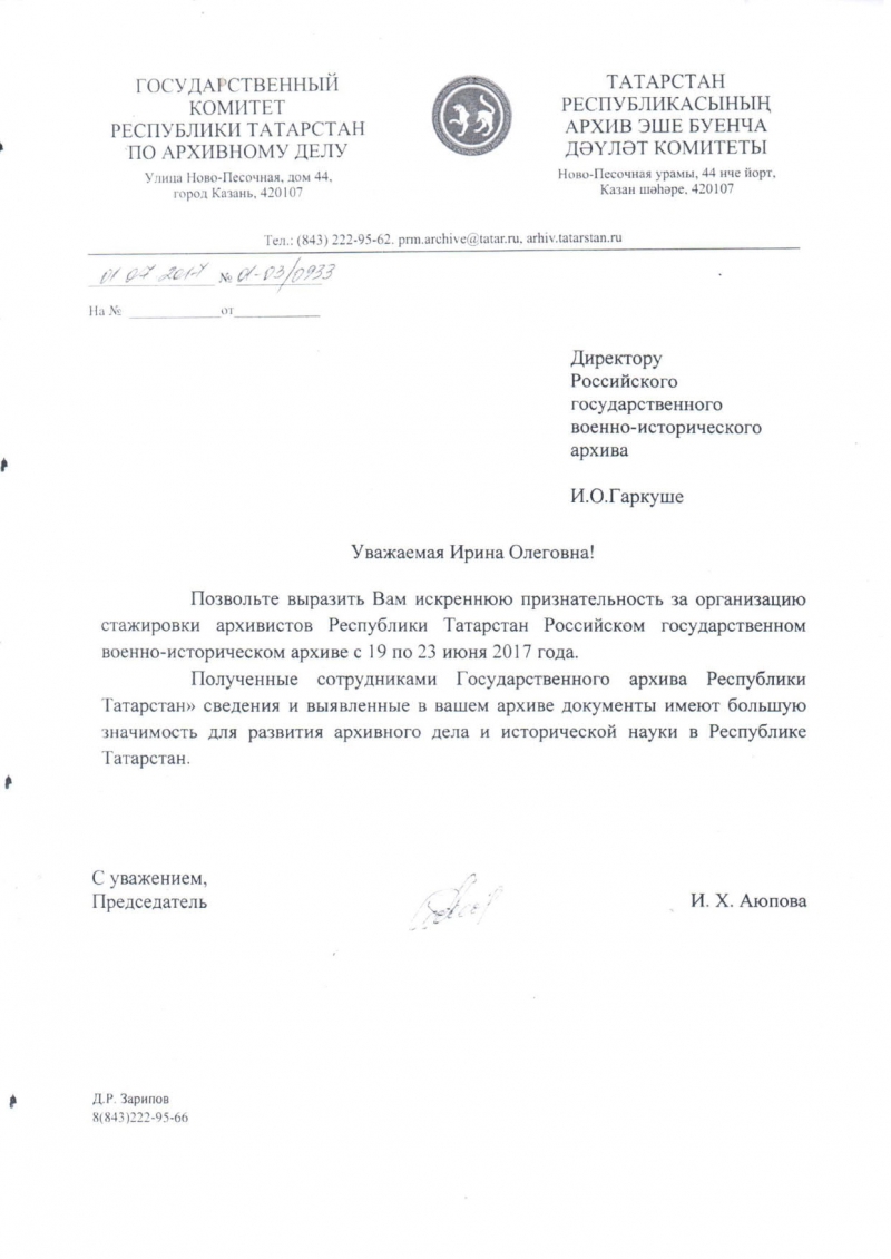14 июля 2017 г. на имя директора РГВИА И.О. Гаркуша поступило благодарственное письмо Государственного комитета Республики Татарстан по архивному делу за подписью председателя комитета И.Х. Аюповой за организацию стажировки архивистов Республики Татарстан в РГВИА в период с 19 по 23 июня 2017 г.